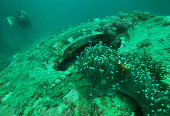 It was only a short drive away…or so we thought. We’d parked at the edge of a cliff and had to walk through an old man’s garden. Then, with all our heavy gear on, we had to basically abseil down a very steep path using a line of tyres and rope to help us. What a kerfuffle it was. Anyway, when we finally reached the bottom, we got ourselves in and had a great time. Again, the scenery was remarkable down there; such beautiful corals and sea life. I really was surprised. We had a lot of fun messing around, and dived for over an hour; that’s rare!