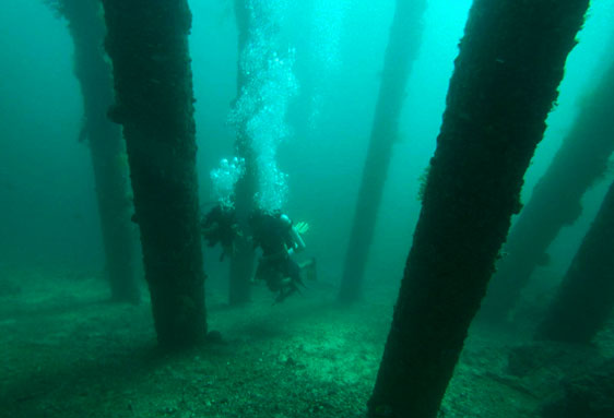 After we’d finished we had to wrangle with the ascent up the rubber tyres and steep dirt hill that we’d come down before. This time, though, we were wet through and even heavier. We drove too Lazi and had a buffet lunch, before continuing to our final dive. Thankfully there was no mountain climbing required as we were right by the sea. The dive master did slip over on the rocks though, so not without its dangers. For this dive, we had to swim for 20 minutes along the coast to reach a huge stone pier. This was itself an entirely different ecosystem, full of creatures clinging to the concrete pillars supporting the pier. There were some truly strange looking creatures; what a great world we live in.
