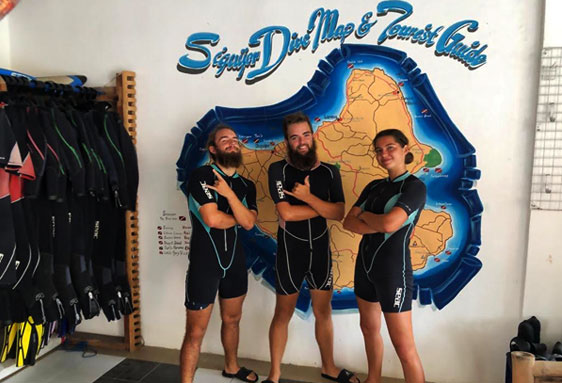 We got up early today, at 7:30am, because it was a special day. It was Gina’s birthday, and we’d planned to do something cool for it: scuba diving. After having breakfast, we hopped on our bikes and drove to the dive shop, only 10 minutes away or so. The 3 of us tried our suits and gear on, then loaded it onto the truck, and were on our way. Of course, we had a small photo shoot to showcase how good(?) we looked in our dive gear. Gotta have fun when you can!